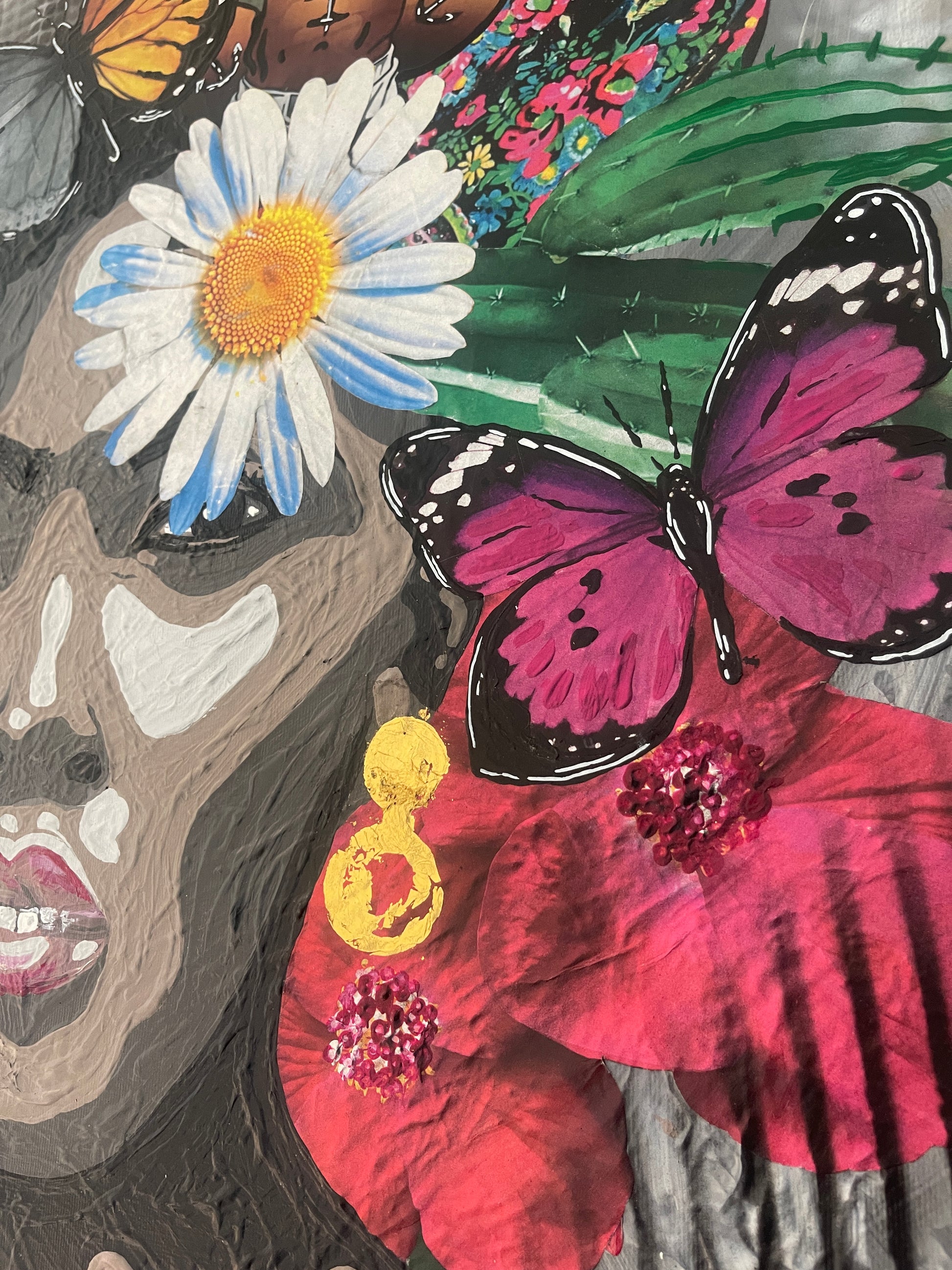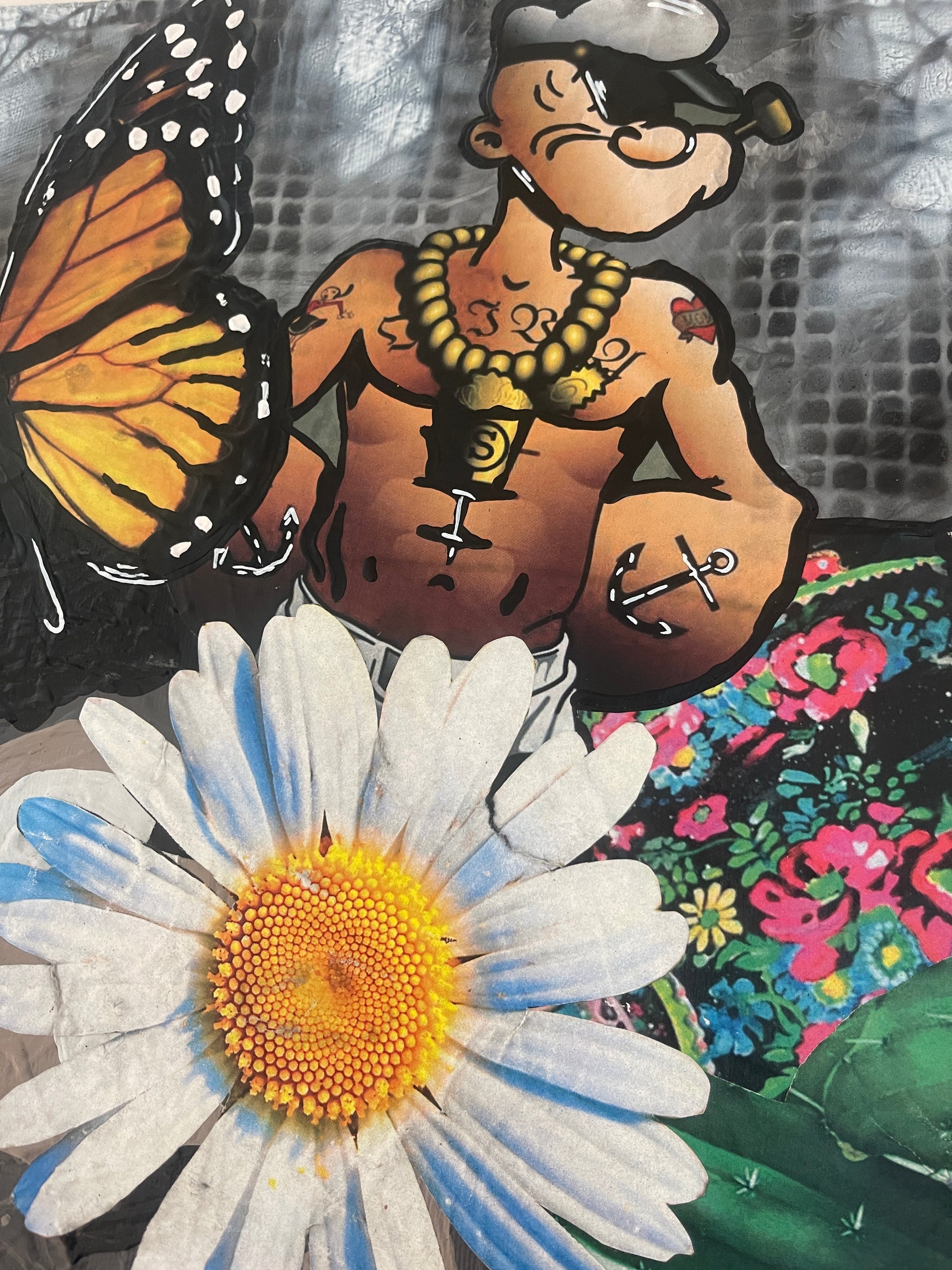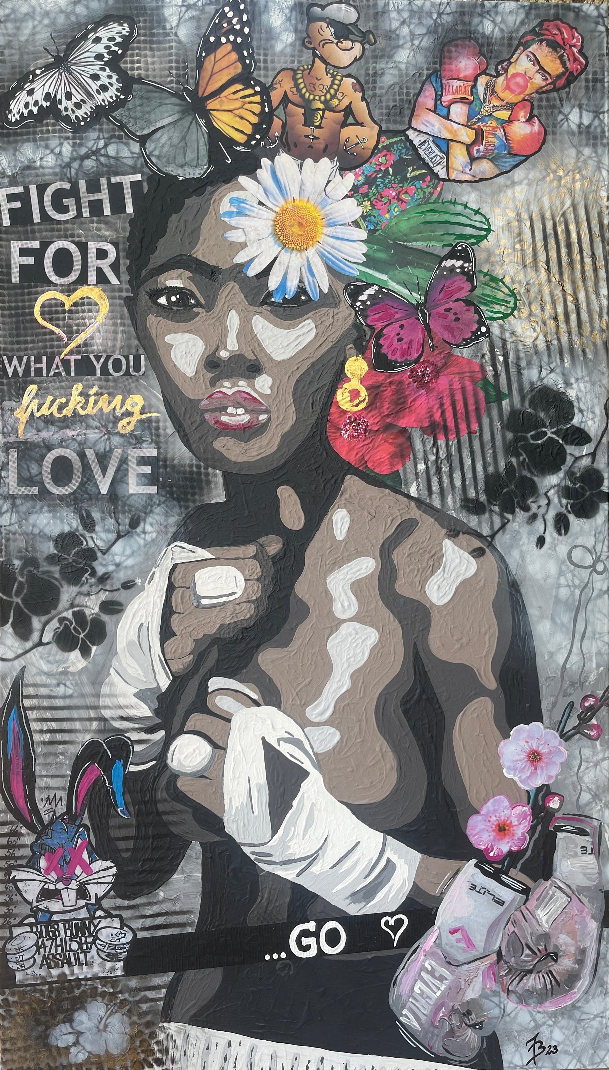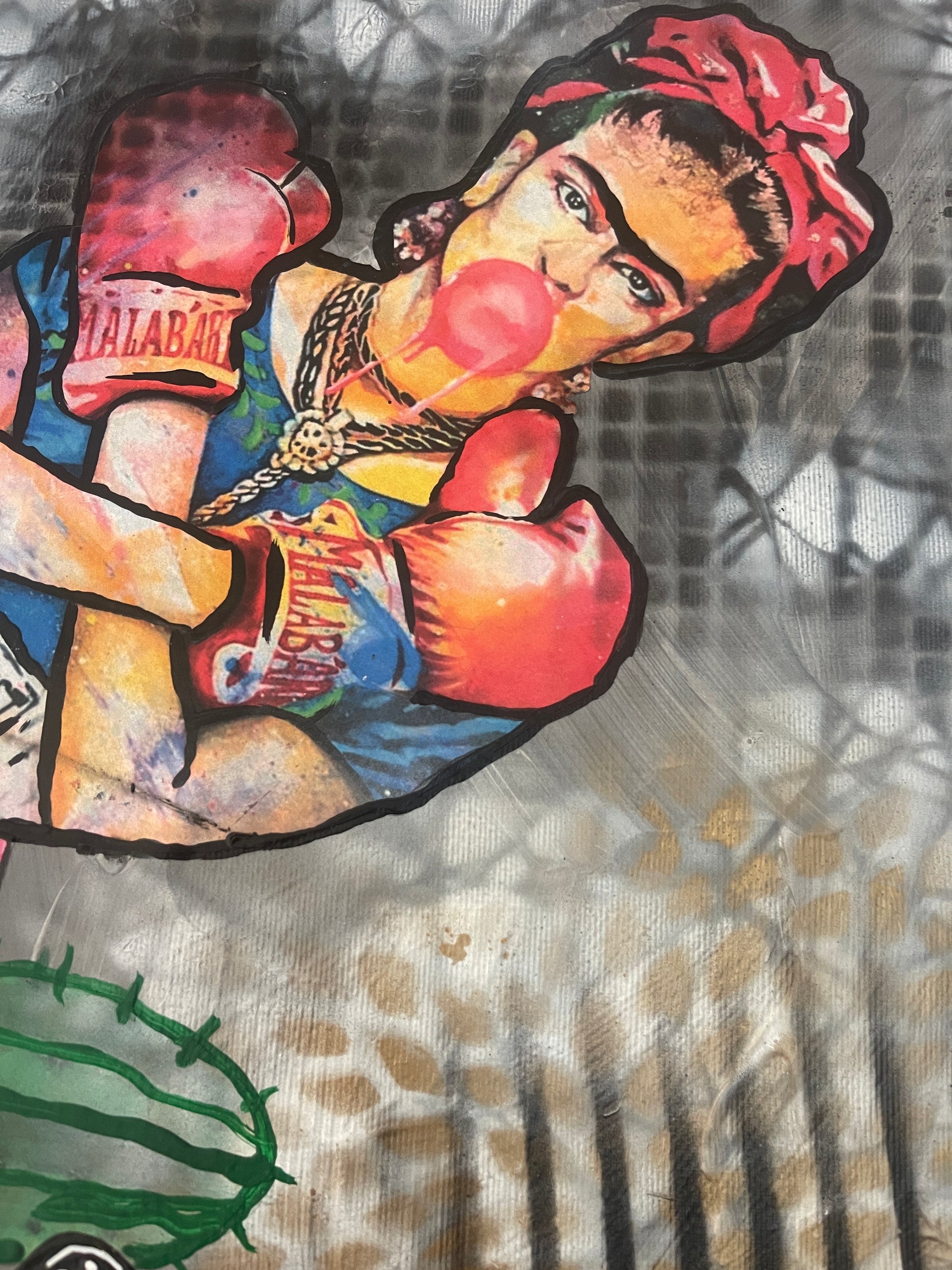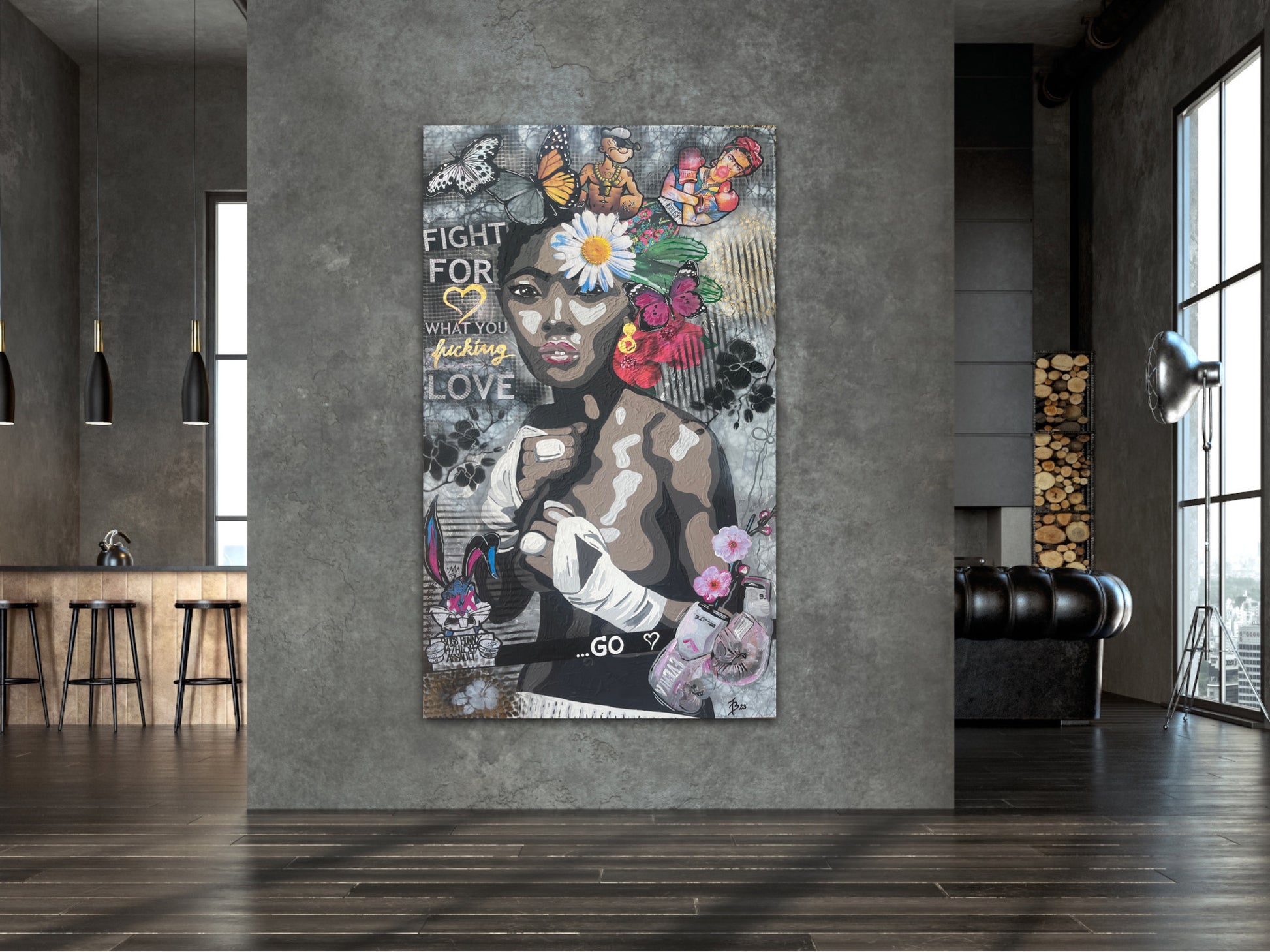 Dieses Kunstwerk sagt mehr als tausend Motivationssprüche: Es knallt, glitzert, schlägt zu – aber mit Herz! Zwischen Frida mit Boxhandschuhen, Popeye im Goldkettenmodus und rebellischen Hasen bleibt nur eine Botschaft: Zieh durch. Mit Lippenstift, Faust und Blüten im Haar.