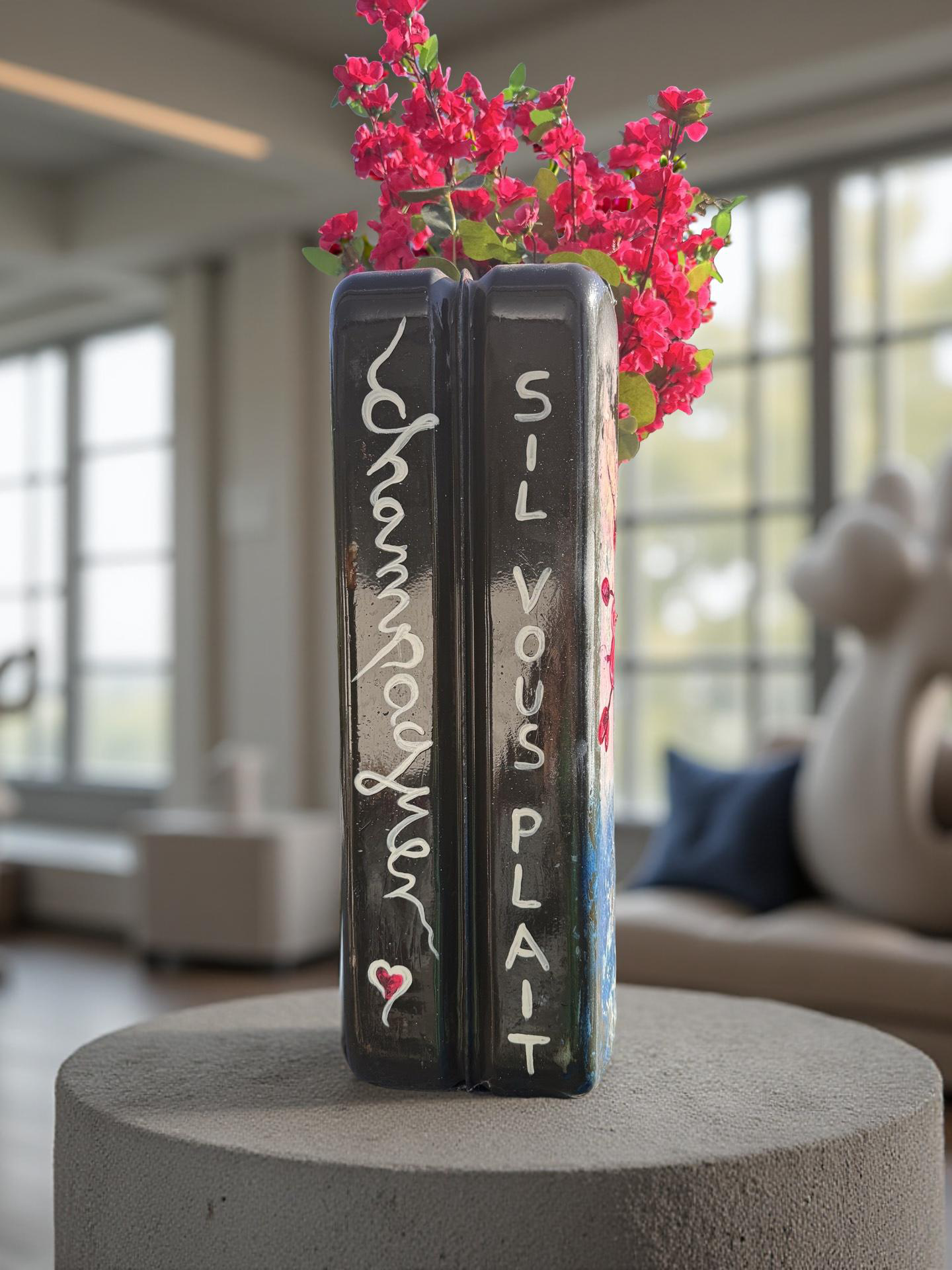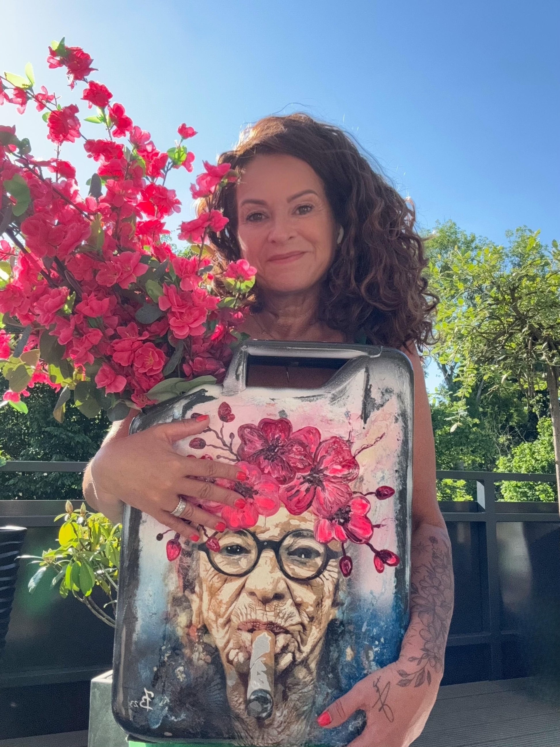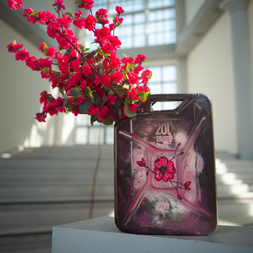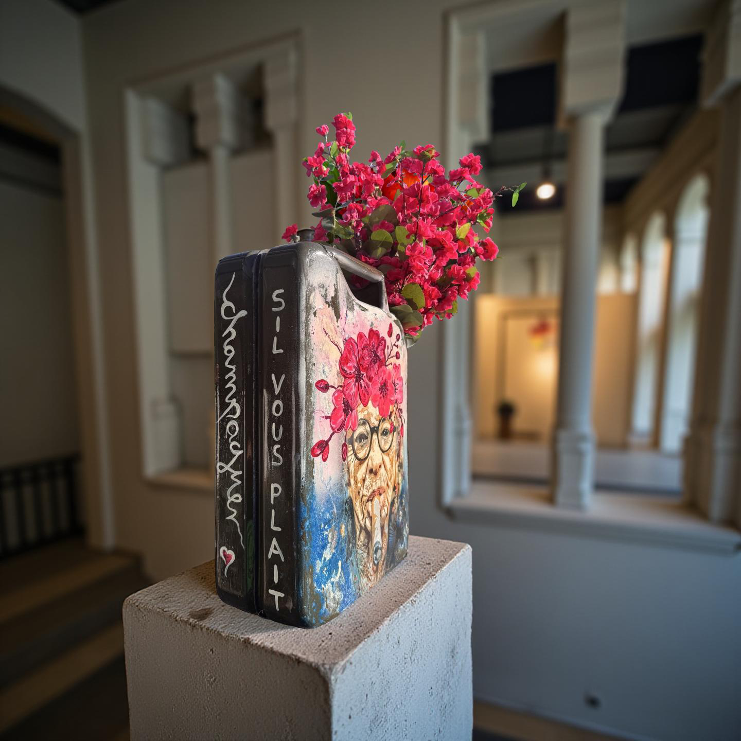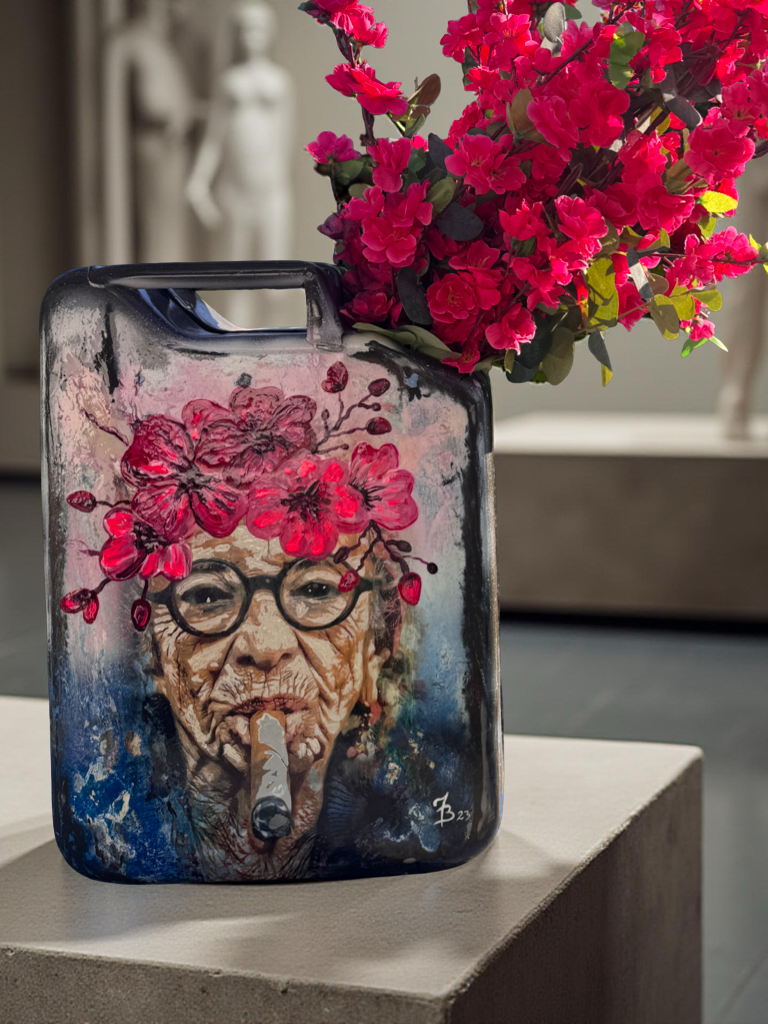 „Von der Front direkt ins Wohnzimmer – Dieser Kanister hat mehr erlebt als so mancher von uns und er hat sich rausgeputzt! Mit Zigarre im Mund, Blüten im Kopf und ‘Champagner, s’il vous plaît’ im Herzen bringt er Stil, Witz und ein bisschen Wahnsinn in dein Zuhause. Für alle, die Kunst mit Charakter lieben!“