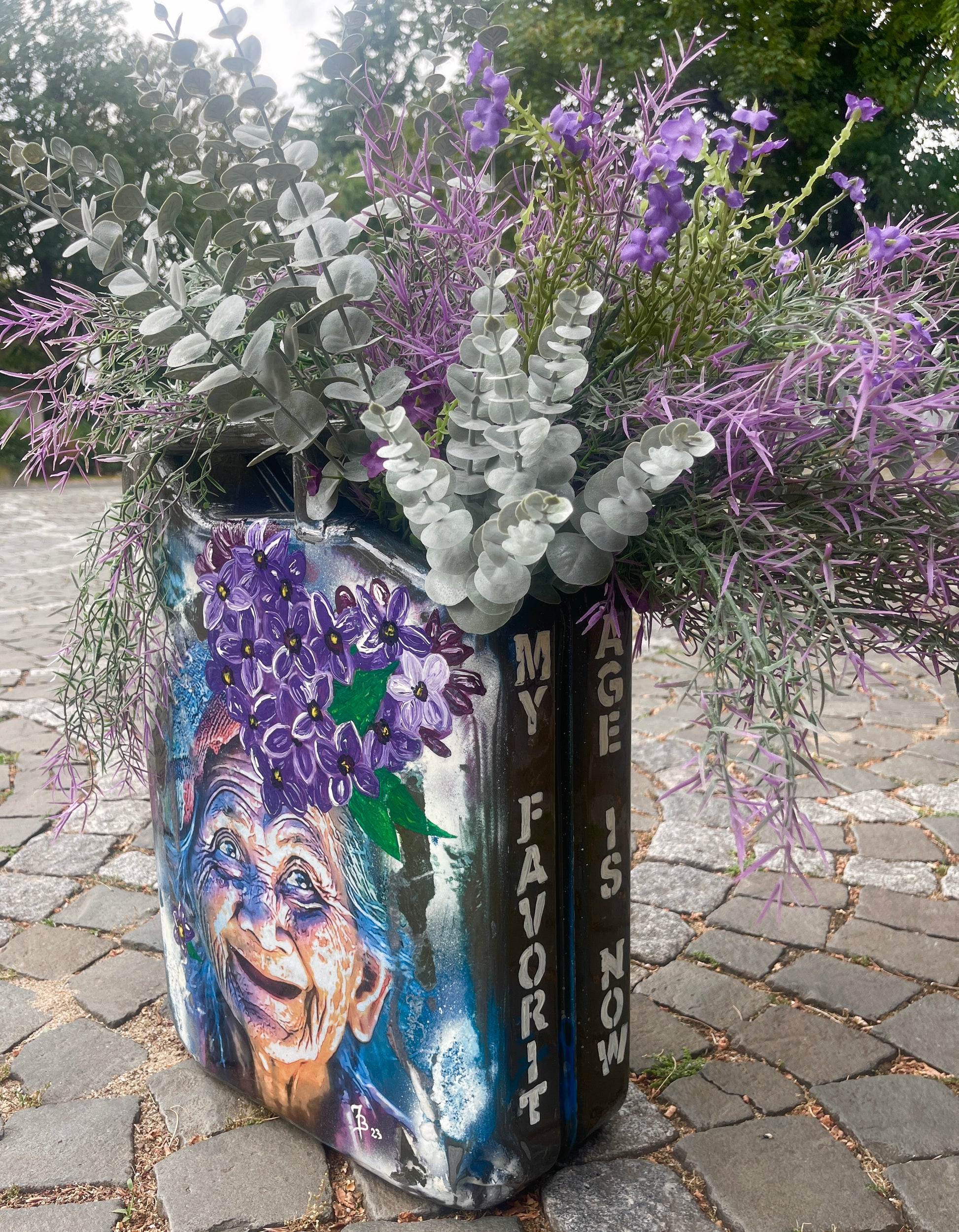 Dieser ehemalige Armee-Kanister hat seine militärische Laufbahn an den Nagel gehängt und ist jetzt offiziell im Ruhestand – als Blumen-Omi mit Stil!