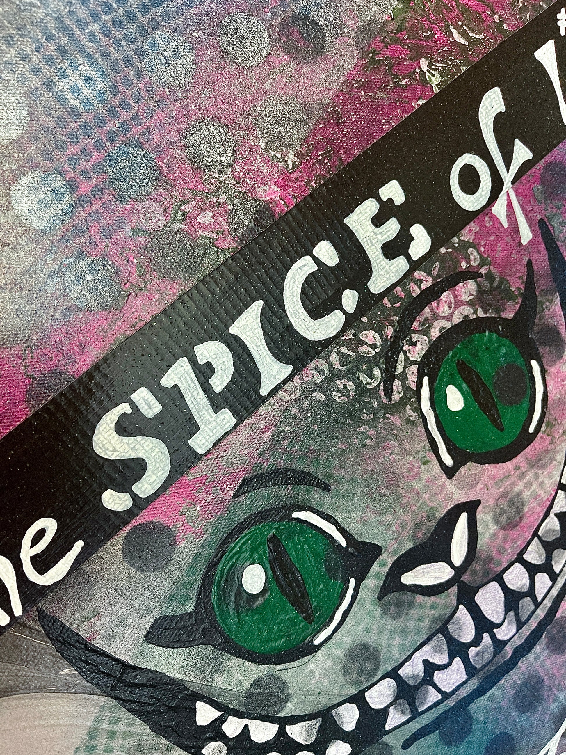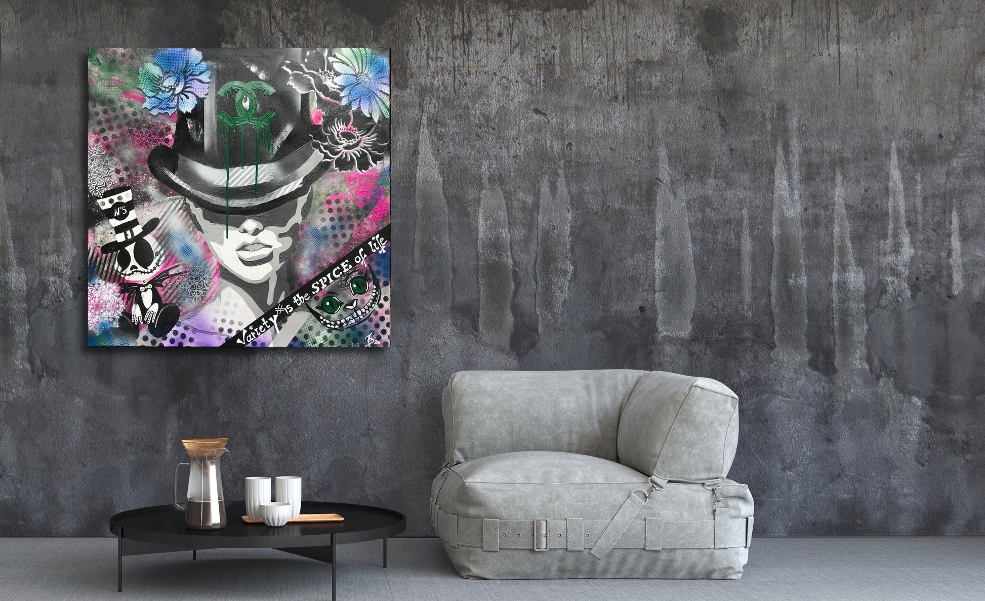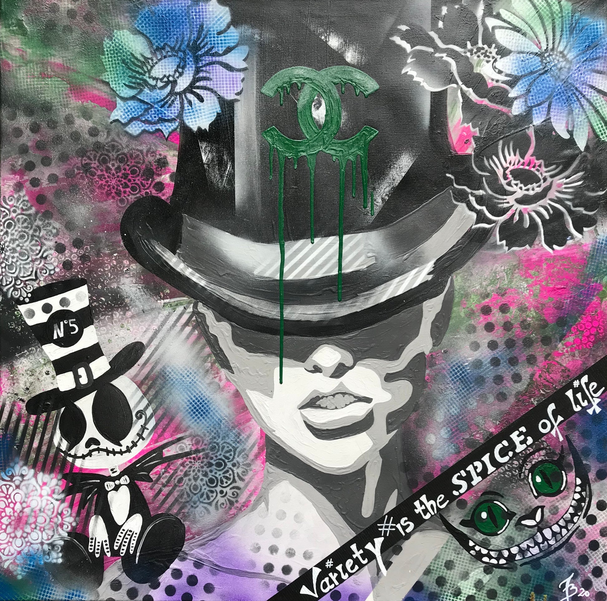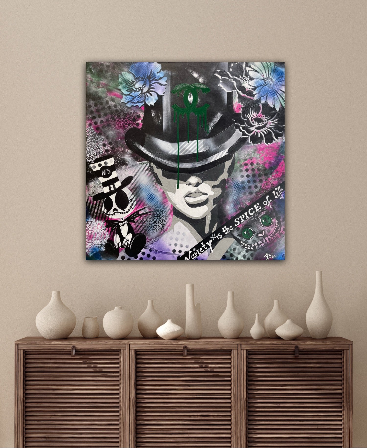 Mode, Mysterium, Mad Hatter Vibes und ein Hauch Chanel-Satire: Dieses Kunstwerk mixt Popkultur, Streetstyle und Ironie zu einem bunten Augenschmaus mit doppeltem Augenblinzeln.
