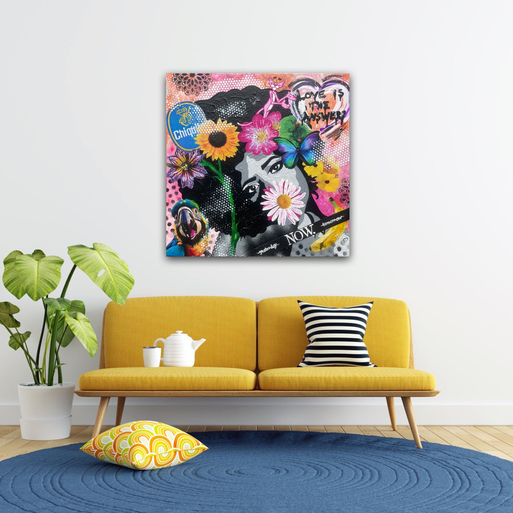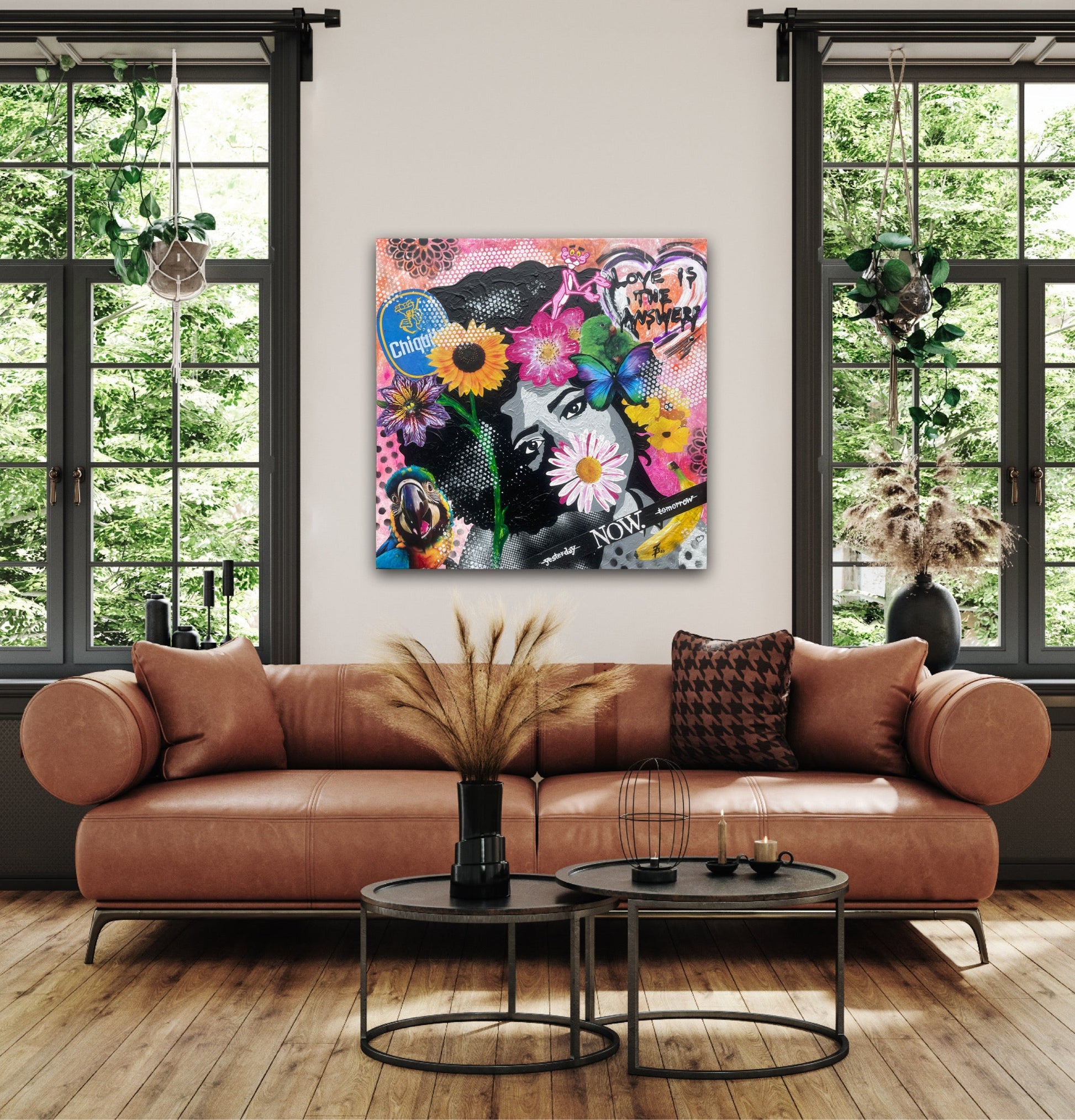 Dieses Kunstwerk ist ein wildes, farbenfrohes Statement – für Lebensfreude, Liebe und eine große Portion „Mir doch Banane, was gestern war“.