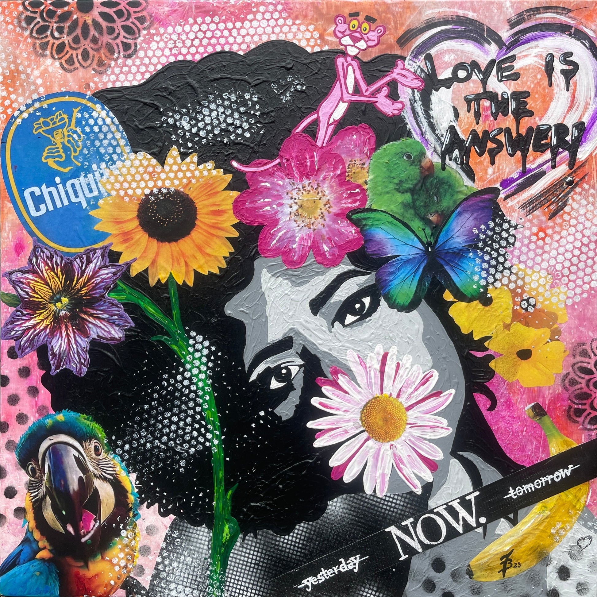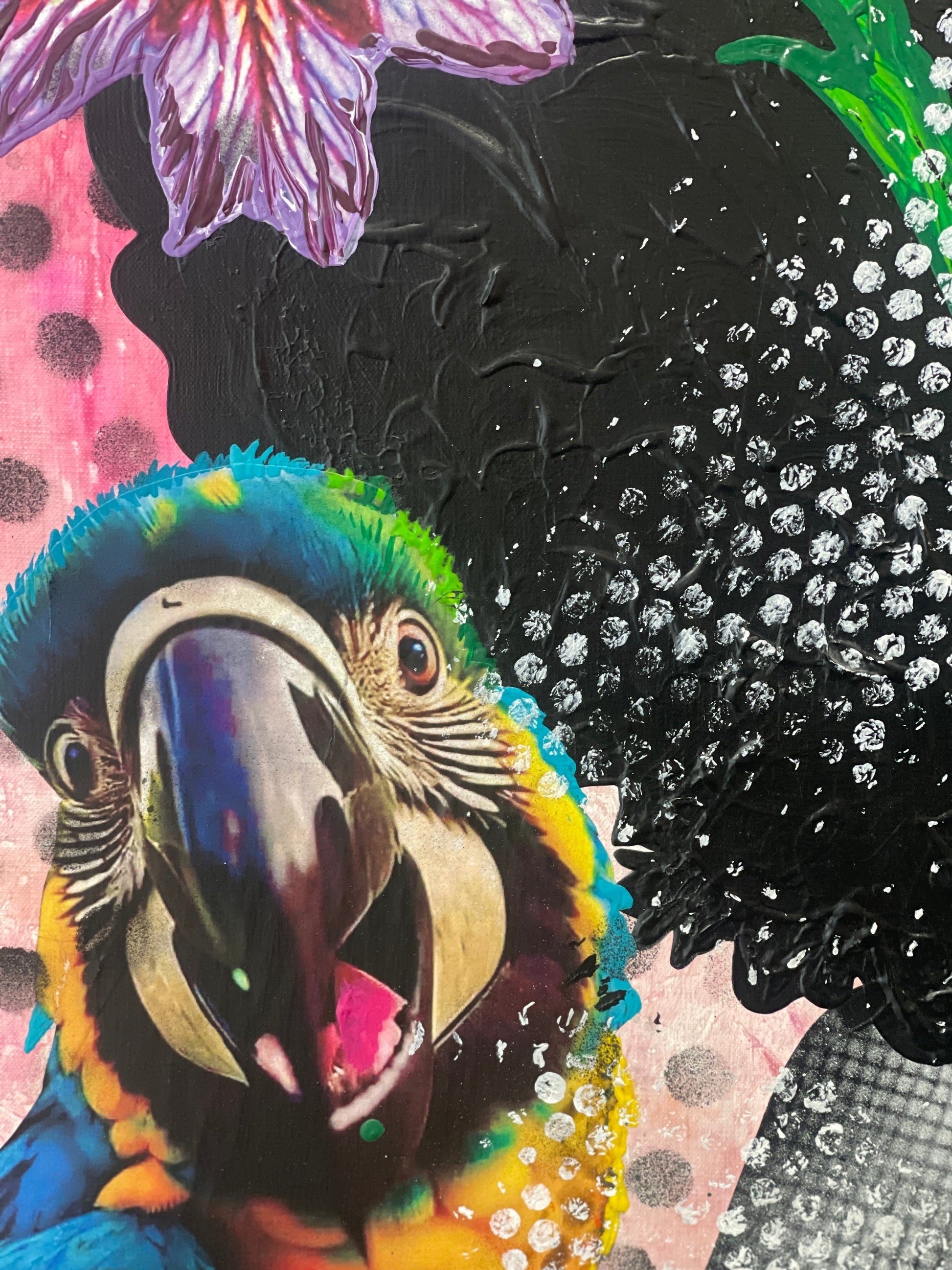Dieses Kunstwerk ist wie ein tropischer Smoothie mit Glitzer: bunt, wild, unerwartet – und verdammt ehrlich. Zwischen Pink Panther, Papagei, Chiquita-Charme und floraler Power stellt sich nur eine Frage:
