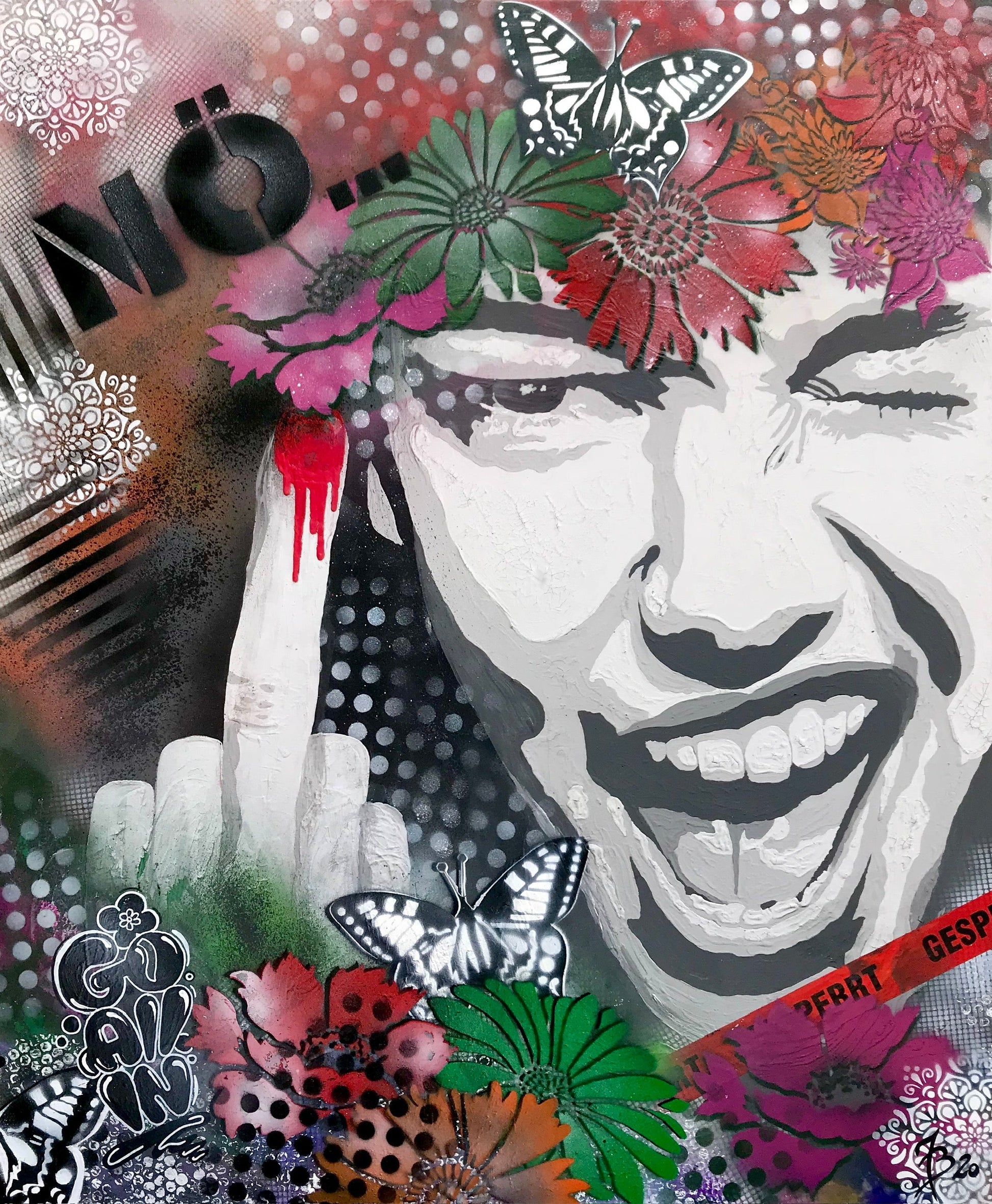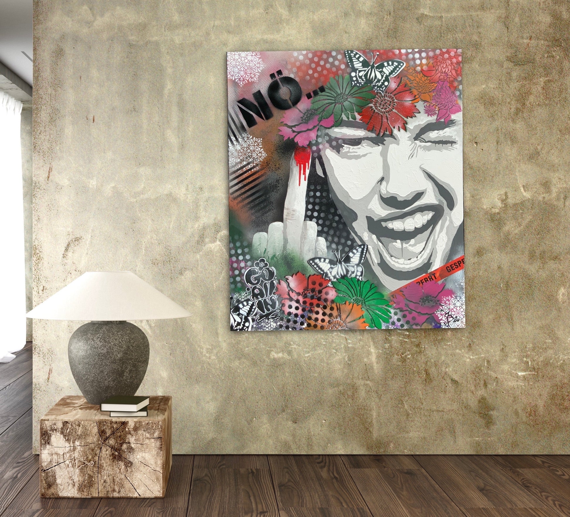 Denn wer sagt, dass klare Grenzen nicht bunt, wild und schön sein dürfen? Dieses Kunstwerk lacht dir frech ins Gesicht und flüstert gleichzeitig: „Ich mach mein Ding. Mit Blumen im Haar und Schmetterlingen im Bauch