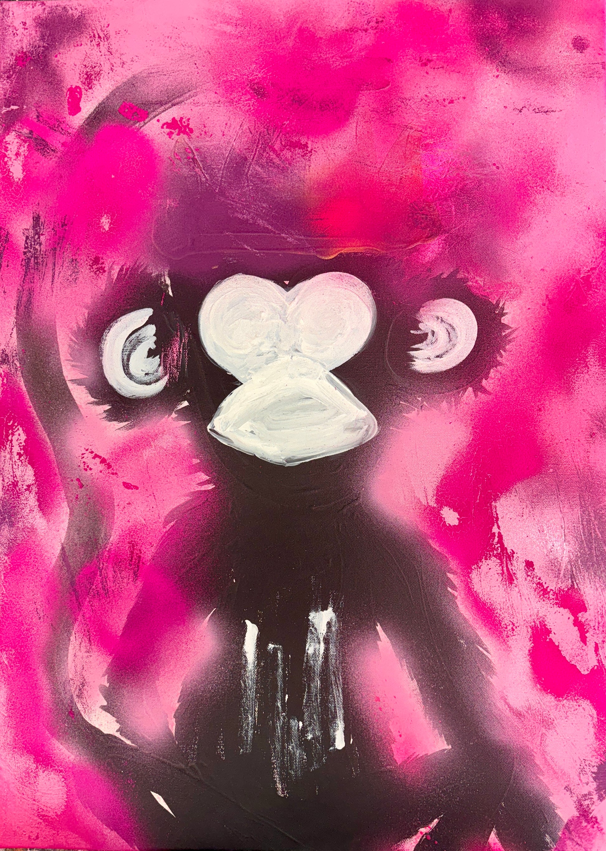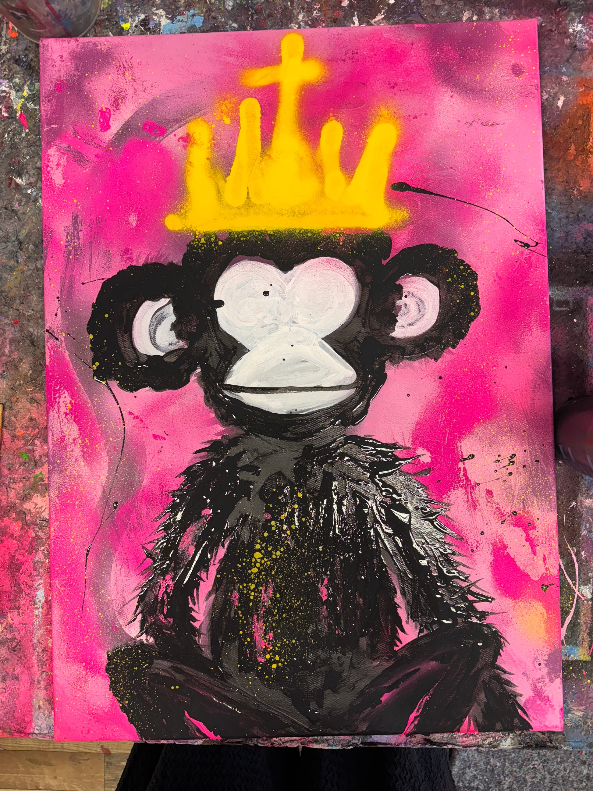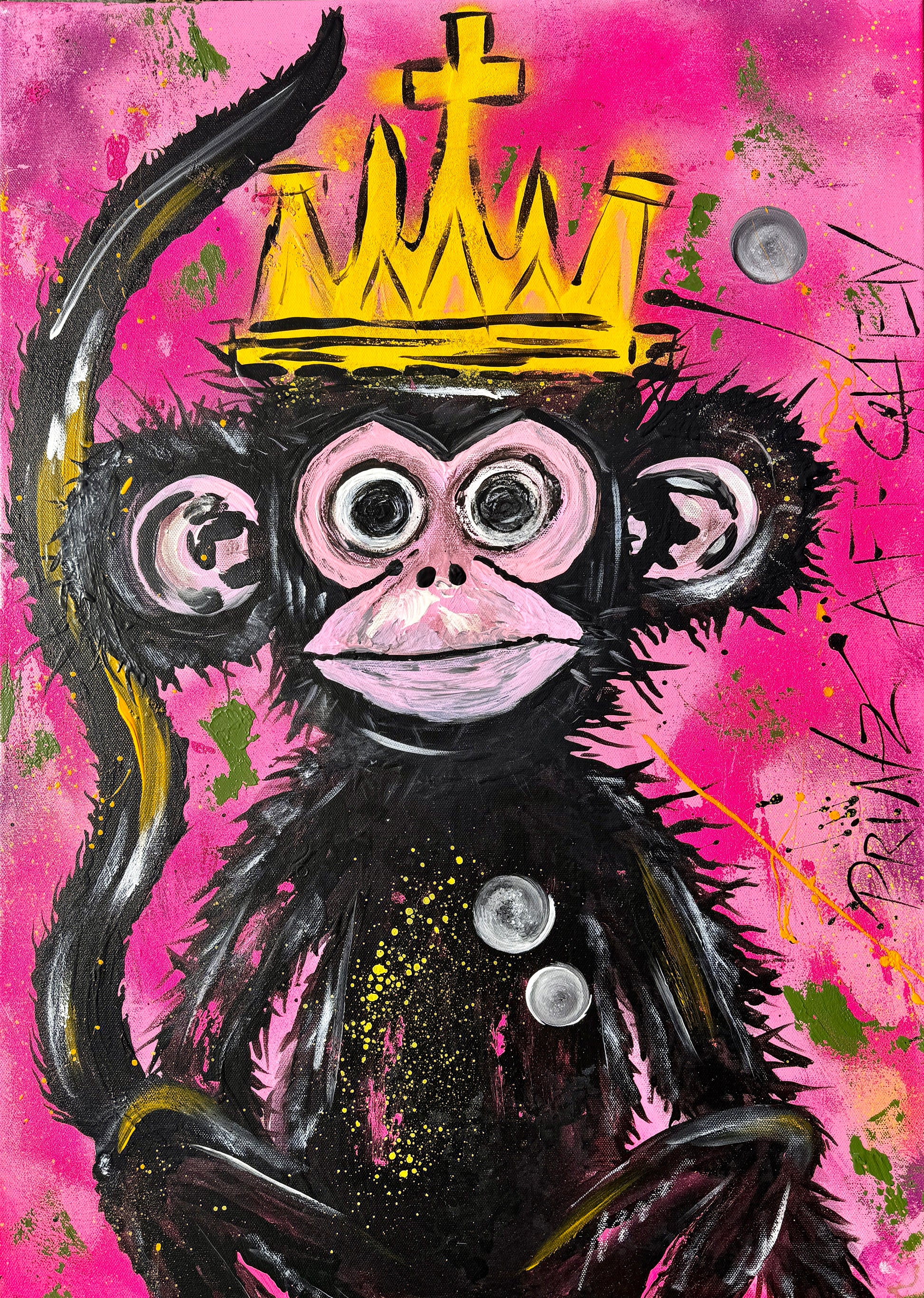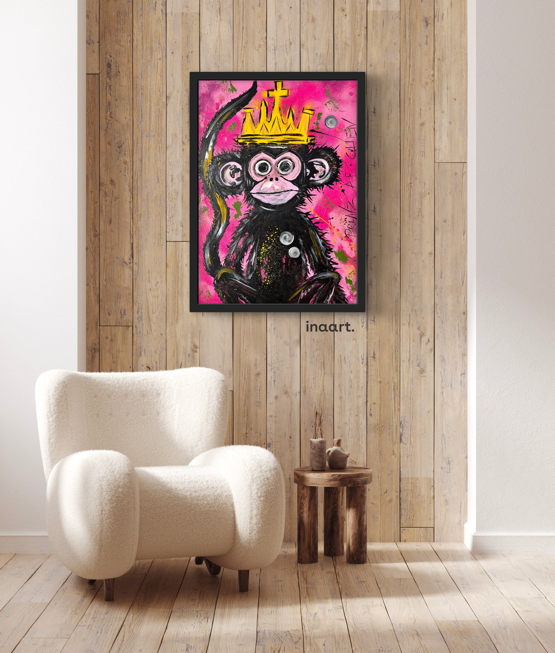 Dieser Affe hat nicht nur den Thron, sondern auch den coolsten Blick der Kunstgeschichte. Mit knalligem Pink, frechem Knopf-Outfit und einer Krone, die selbst Queen Liz nervös machen würde, bringt er royales Chaos und gute Laune an jede Wand.