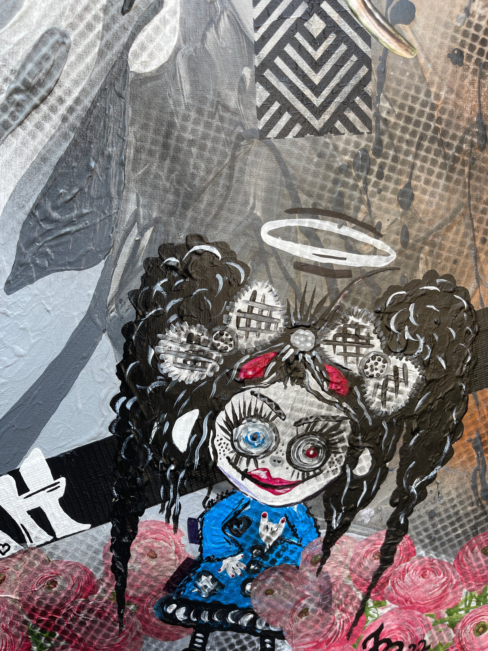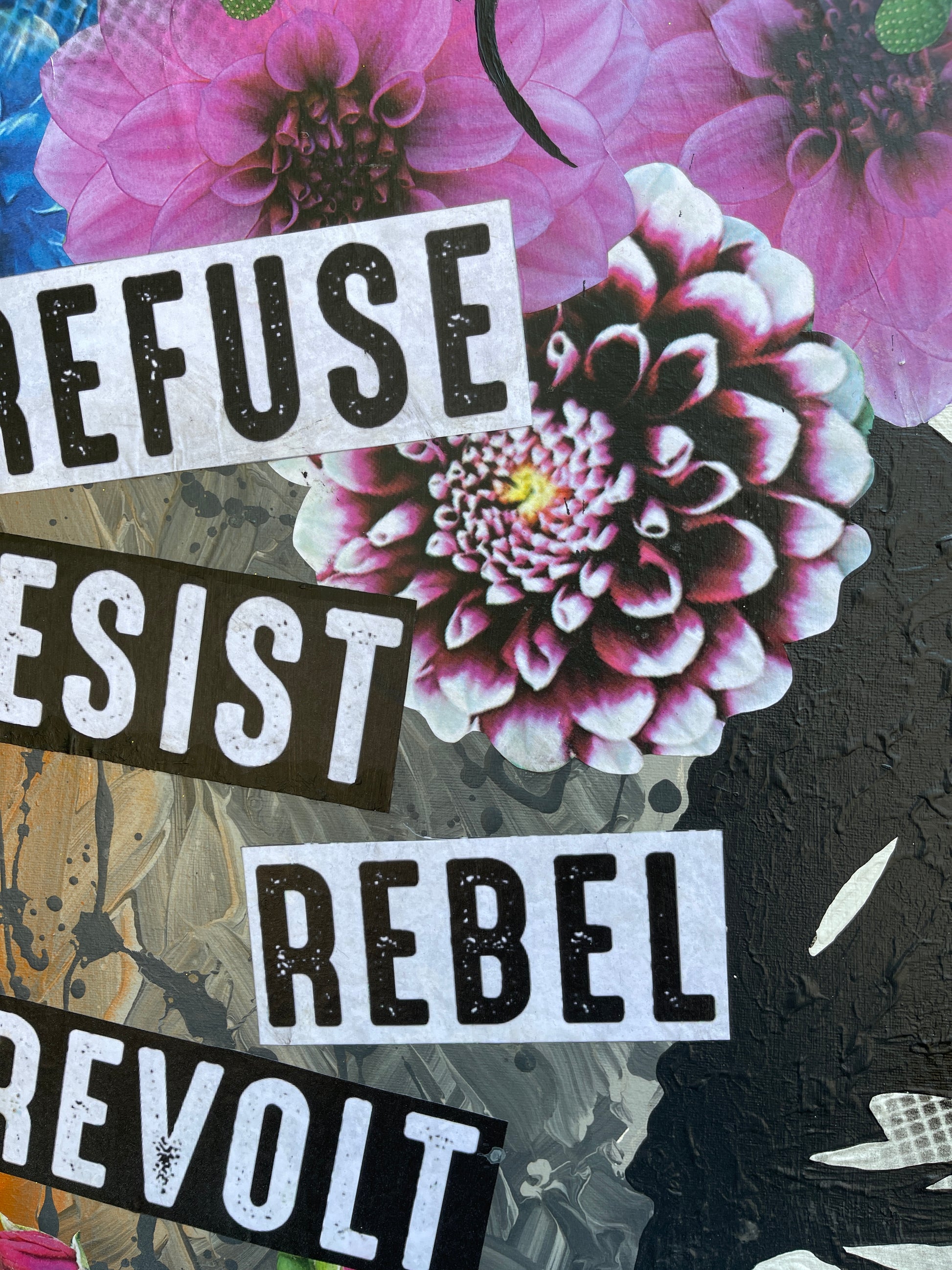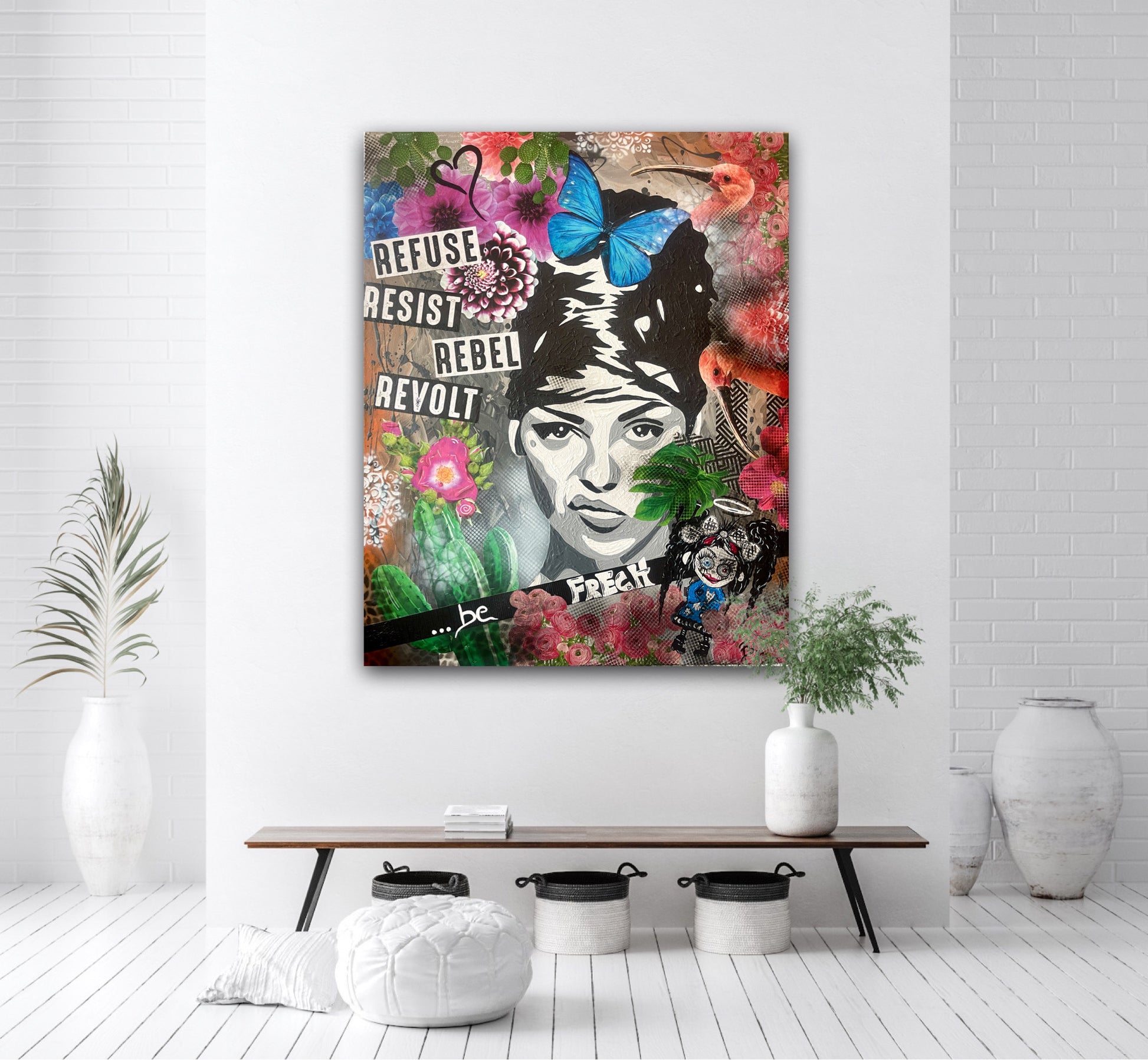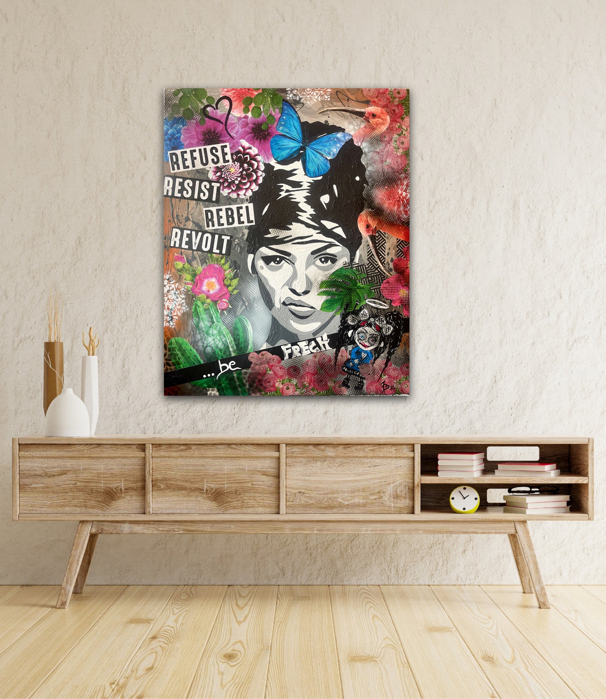 Dieses Kunstwerk ist keine Deko – es ist eine Ansage. Mit starker Frau, stacheligen Kakteen, Chaos und einer Prise Wahnsinn. Hier tanzt der Widerstand in Blumen und Glitzer – und flüstert dir frech zu: