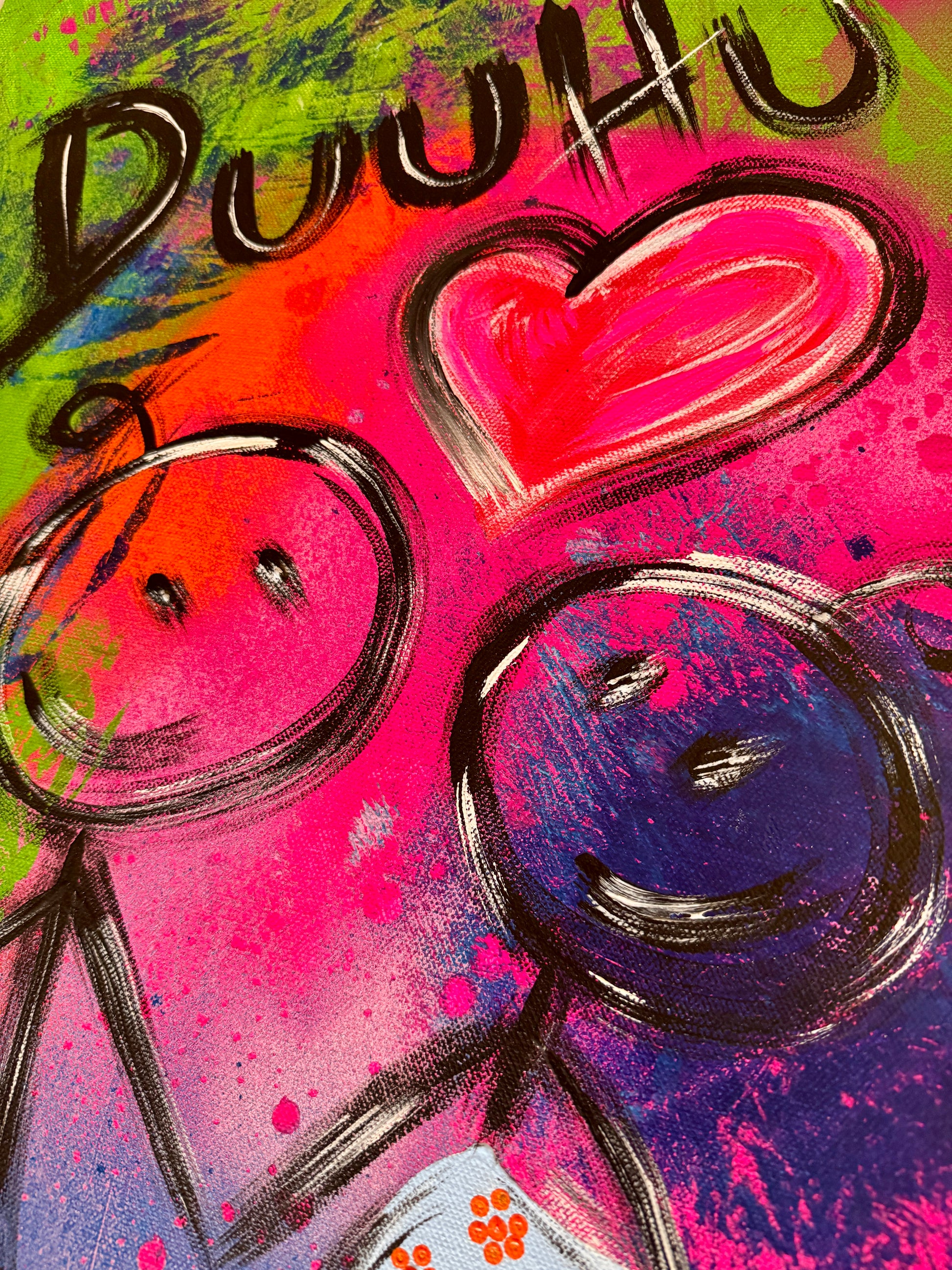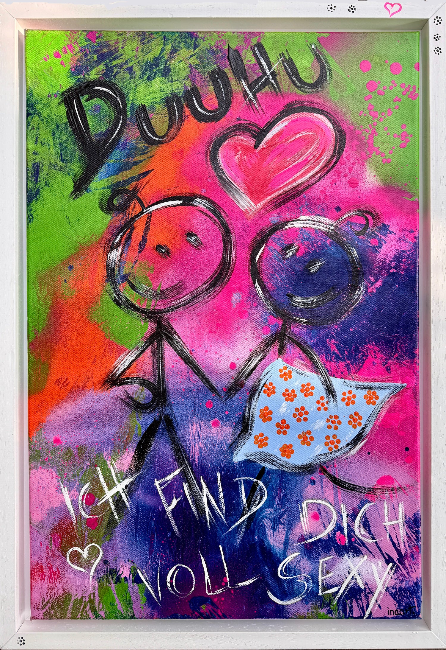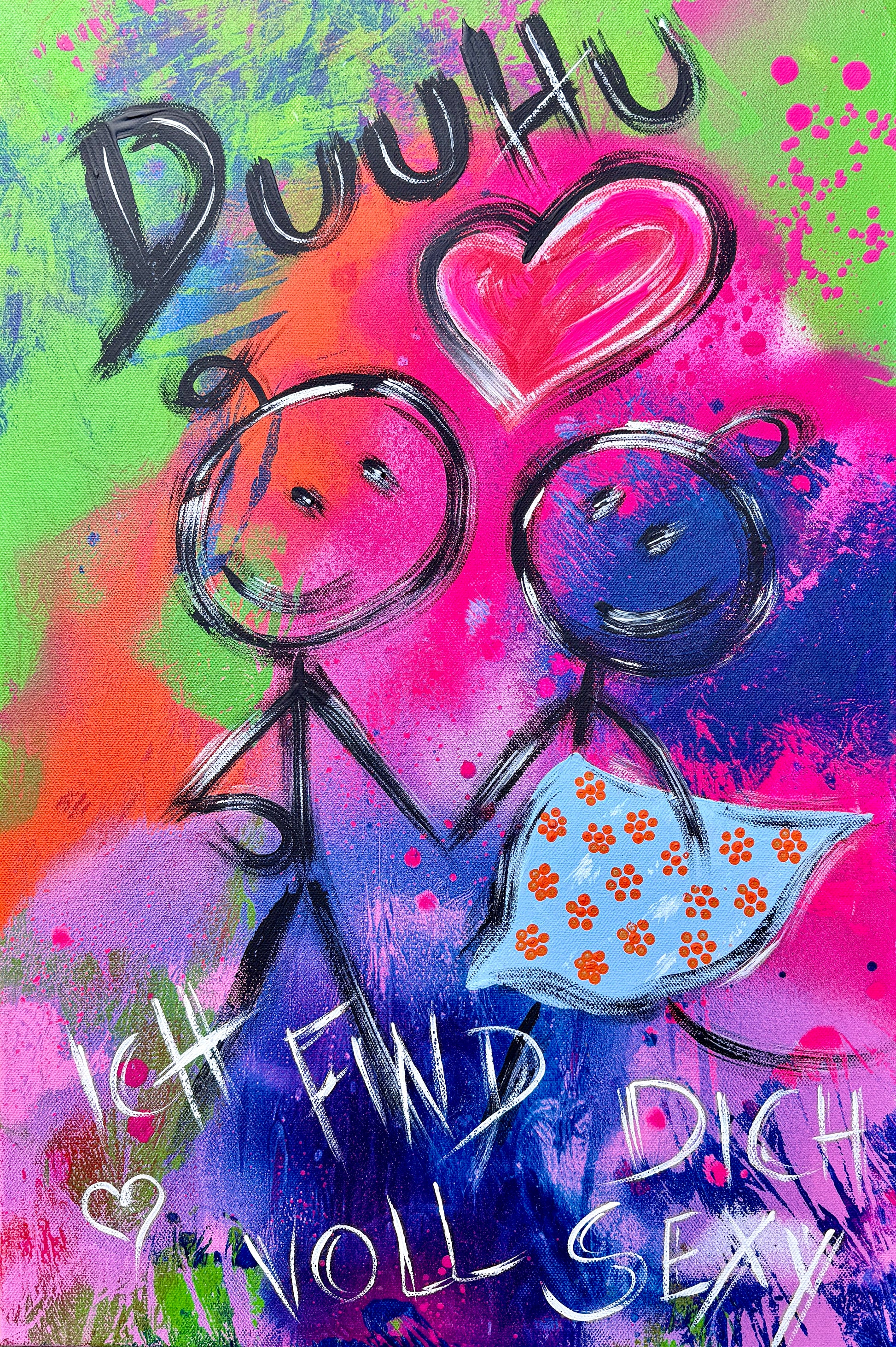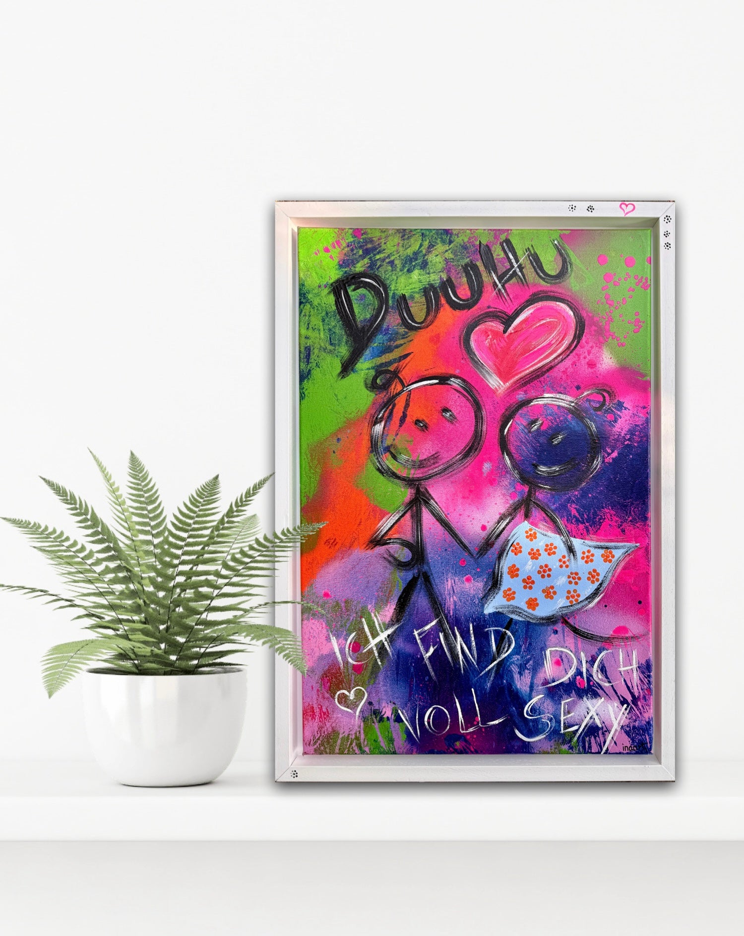 Zwei Strichmännchen, ein Herz, ein frecher Spruch – mehr braucht’s nicht für die große Kunst der kleinen Gesten! Dieses knallbunte Statement-Stück bringt den Humor direkt an die Wand und sorgt garantiert für Gesprächsstoff. Perfekt für alle, die “Ich liebe dich” nicht mit Rosen sagen, sondern mit einem lauten „DUUHU!“ und einem Augenzwinkern.